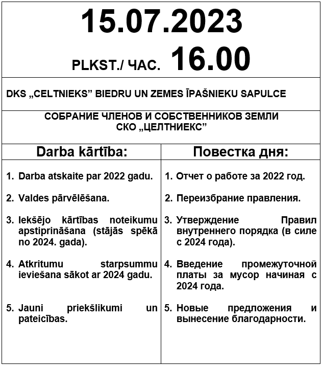 Nosūtam informāciju par DKS "Celtnieks" kopsapulci 15.07.2023.g. (skat. darba kārtību zemāk).