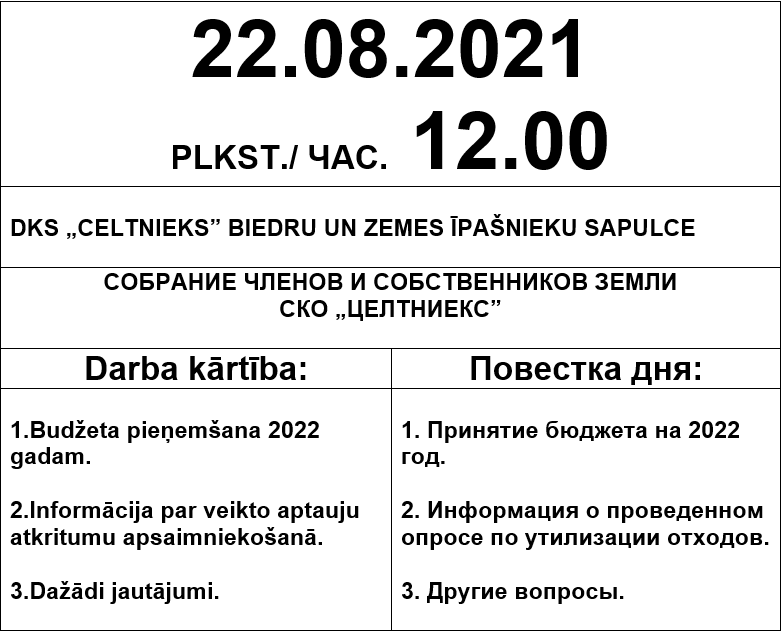 Par DKS "Celtnieks" biedru kopsapulci 22.08.2021. plkst. 12:00 / О собрании СКО "Целтниекс" 22.08.2021. в 12:00 часов
